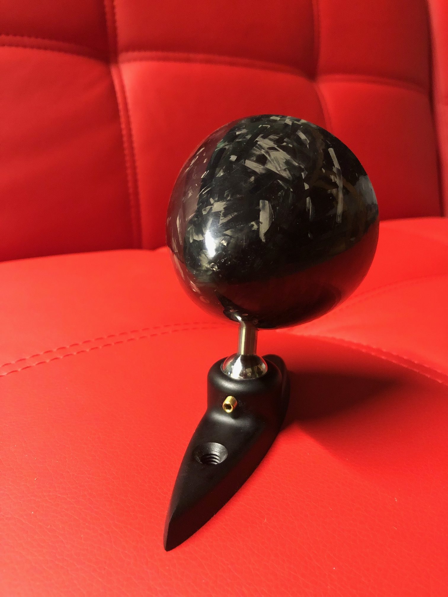The 3″ mirror itself is glass. The bullet portion is carbon fiber with a 5/16″ stainless steel post that is housed in a black anodized aluminum base. We have (2) holes in the base to allow you to mount it to your door or perhaps fender. The threads within the hole are also 5/16″. You can come up from the under side to grab the base with those threads OR you can run a 1/4″ screw from the top down to the nut on the backside of the panel.